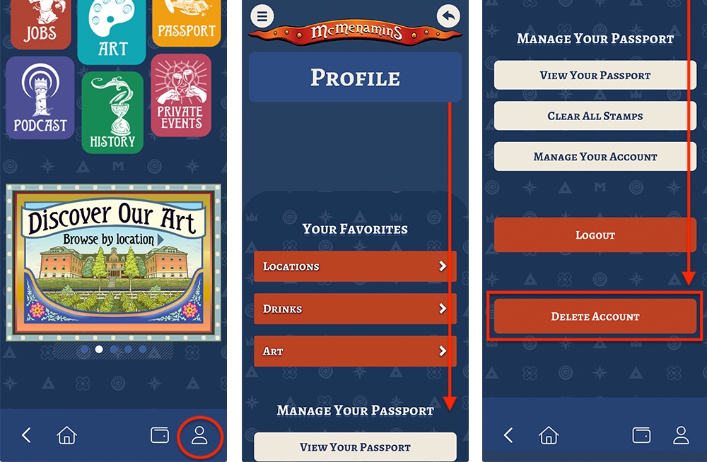 To delete your profile on the McMenamins mobile app, simply login to your account and scroll to the bottom of any page. From there, select the user icon in the bottom right corner. Then at the bottom of your profile screen, you will find a button that says "Delete Account."