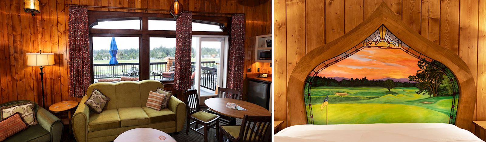 In fair weather relax on the patio, gather ’round the outdoor fire pit with a fresh juice cocktail, or duck into the Pot Bunker Bar, a cozy lair adorned with antique golf clubs.